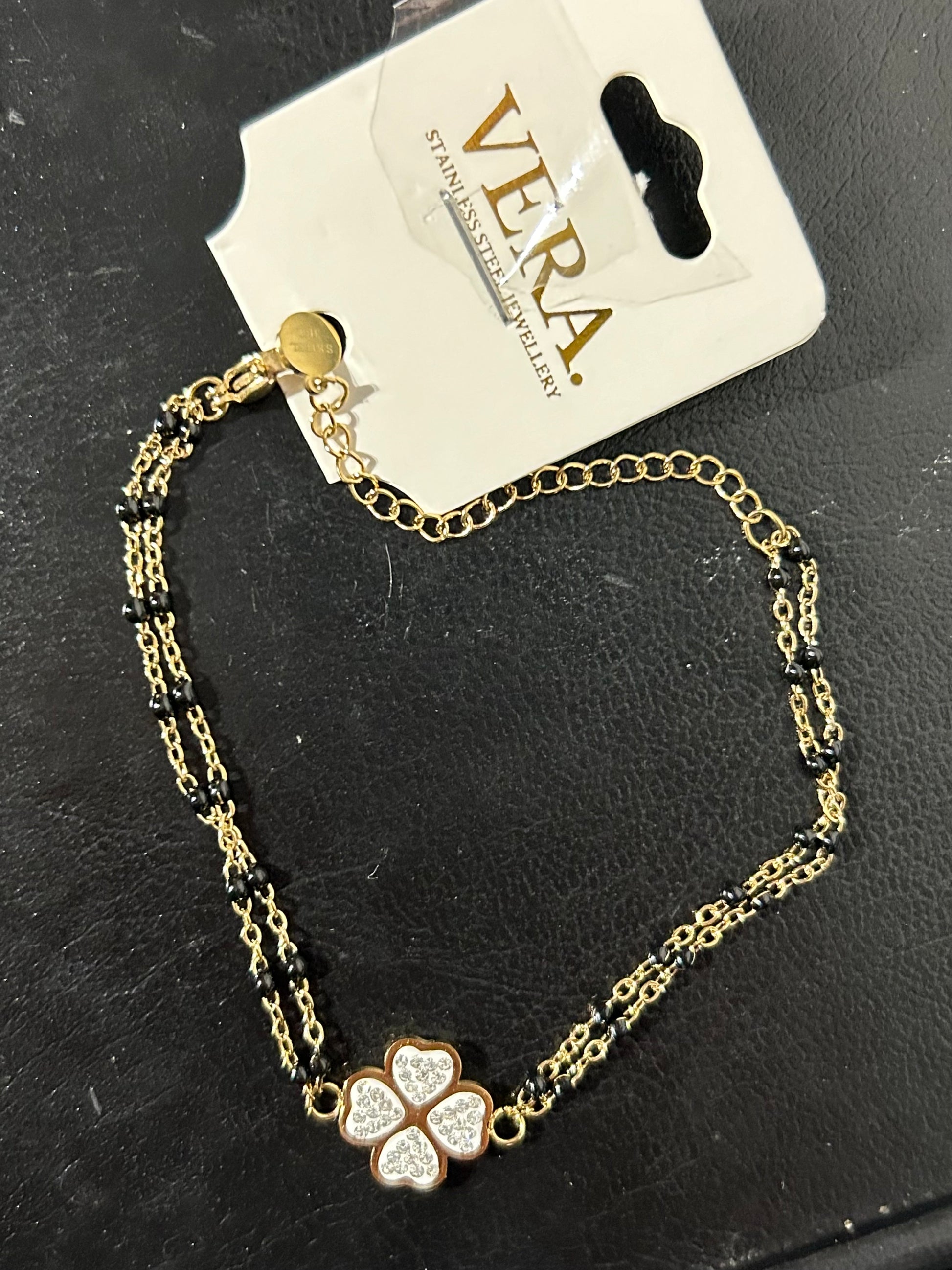 Bransoletka z podwójnym łańcuszkiem oraz okrągłym elementem ozdobionym czarnymi kryształkami. Wykonana ze stali chirurgicznej 316L. Obwód 17 cmz przedłużką 5 cm.