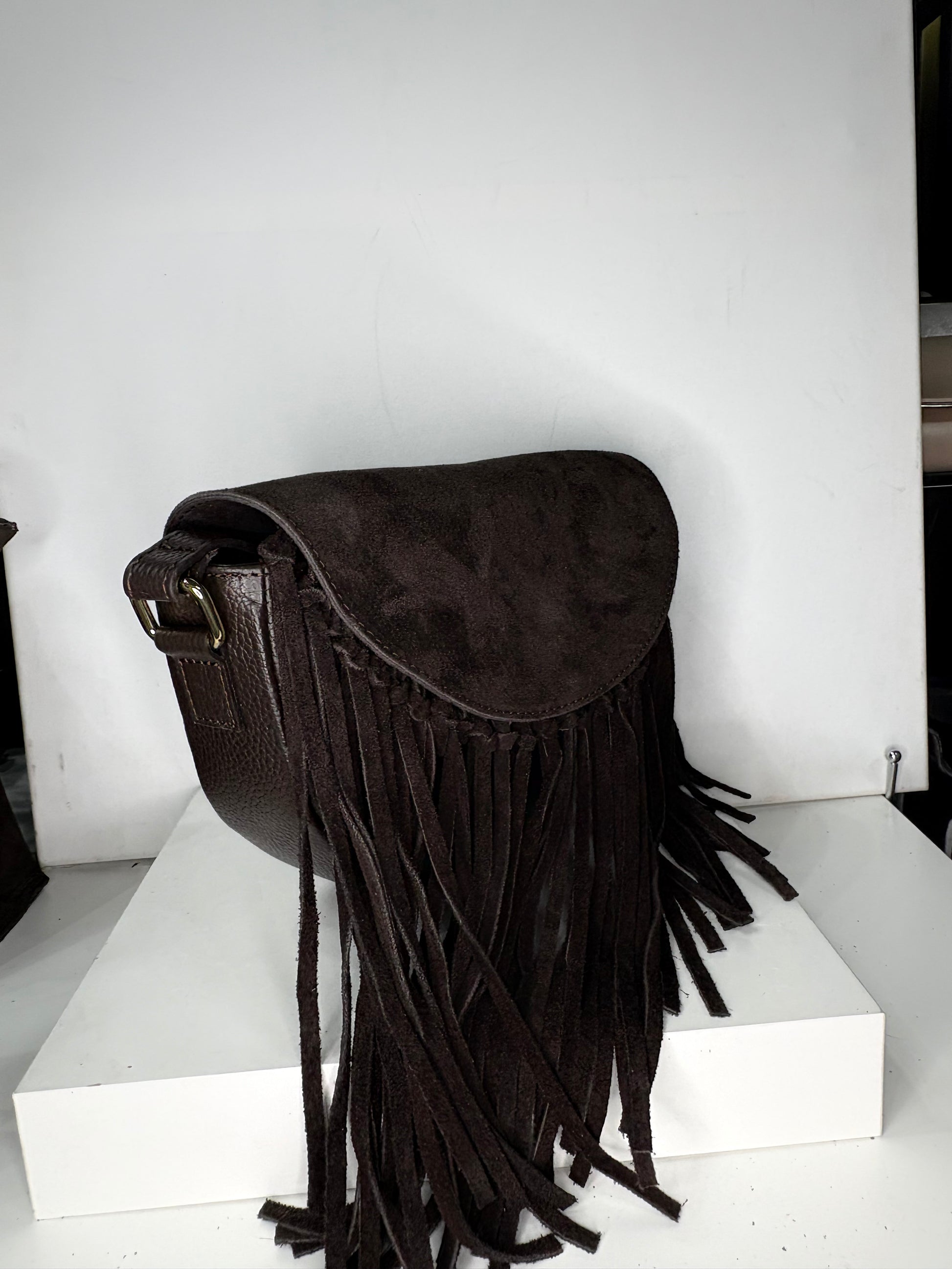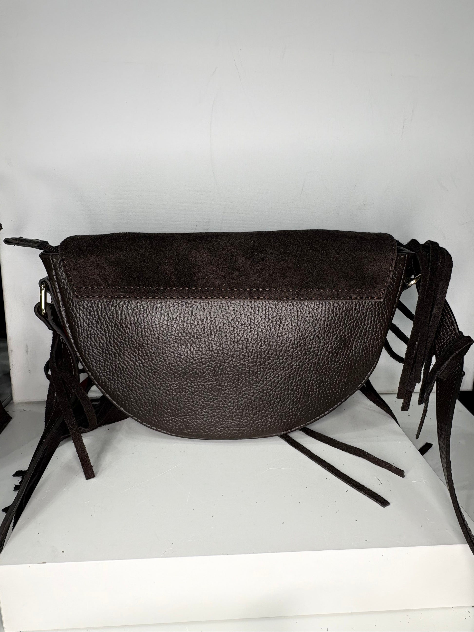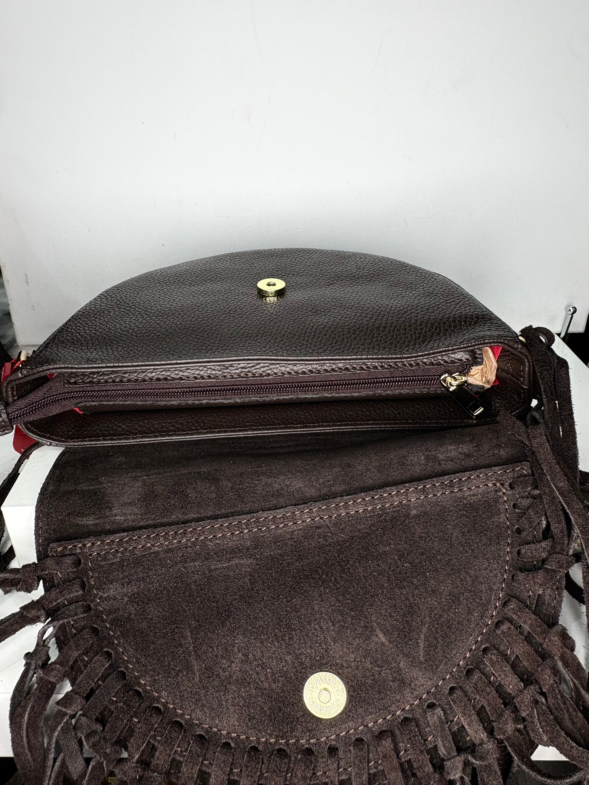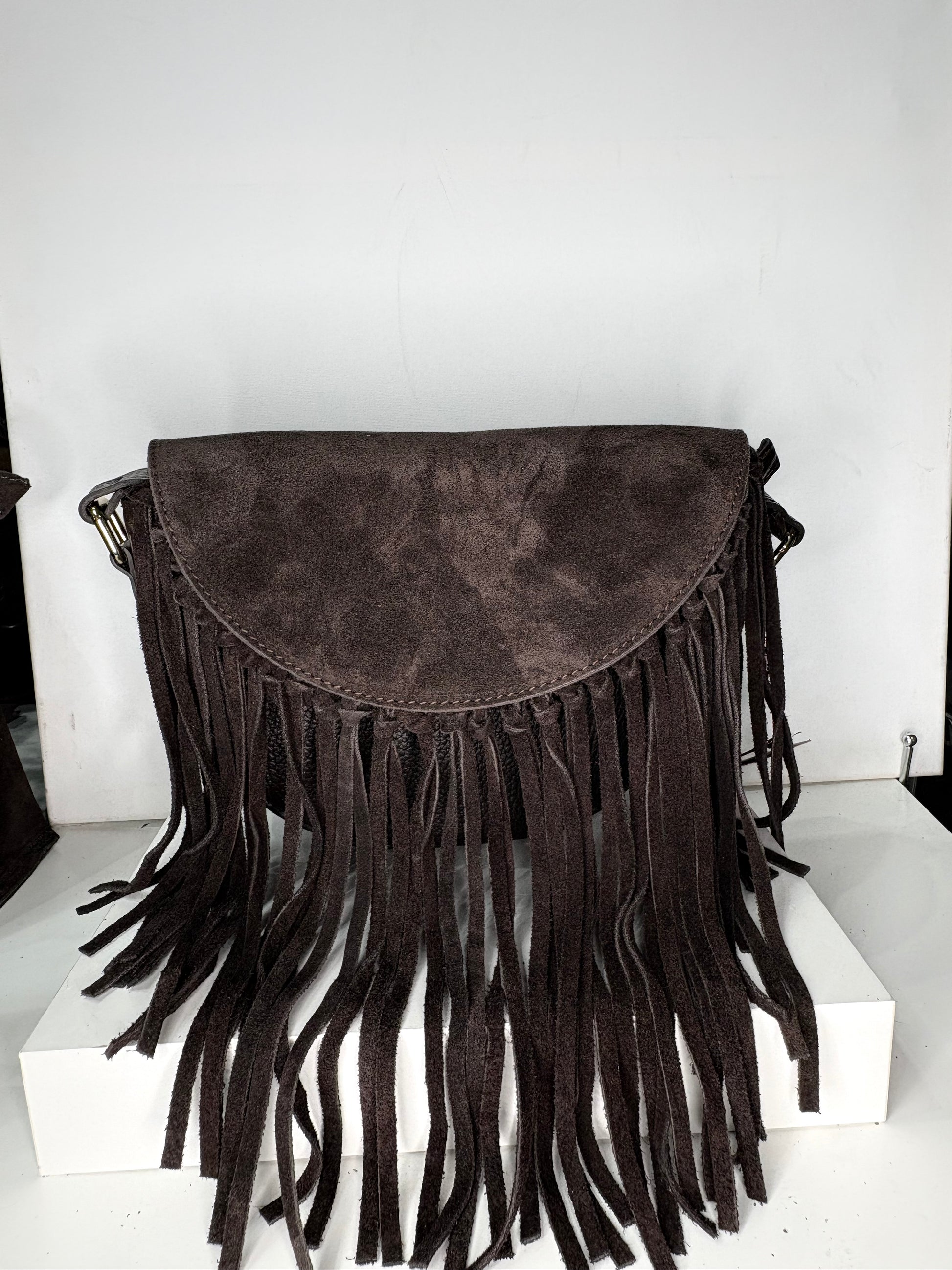 NOWOŚĆ VEZZE Zamszowa torebka listonoszka skóra brązowa czekoladowa frędzle