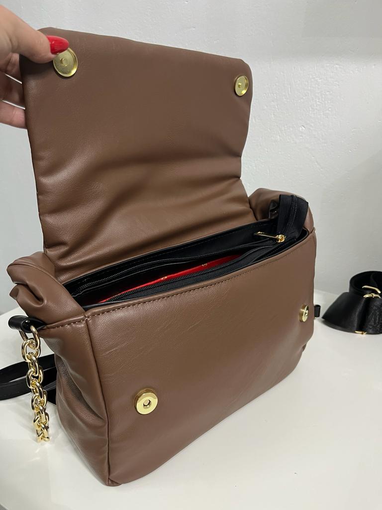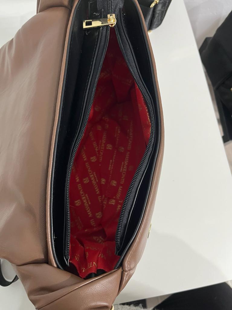 Torebka pikowana Massimo Contti taupe z przekręconą rączką.